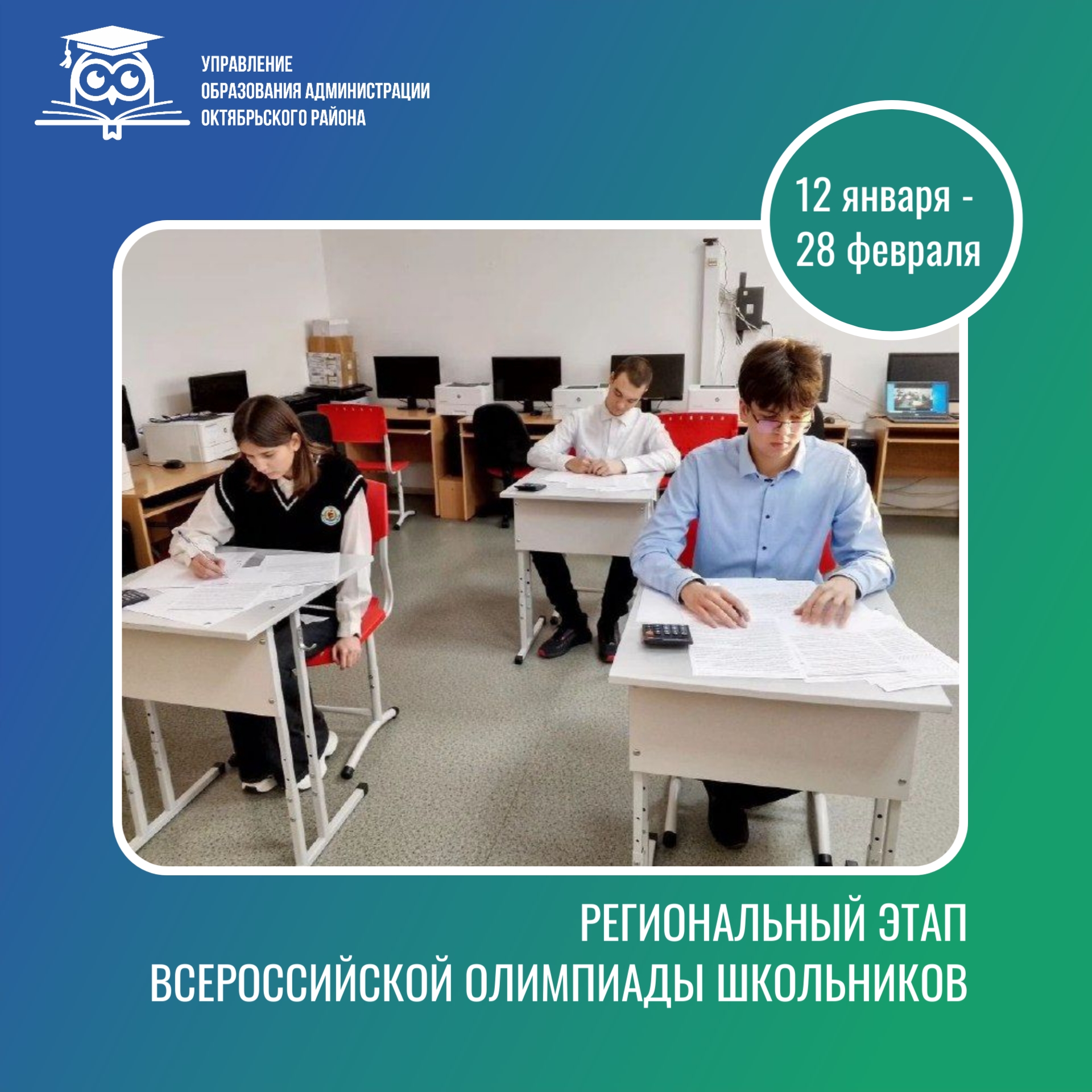 12 января 2026 года стартовал региональный этап всероссийской олимпиады школьников для 76 старшеклассников Октябрьского района. Напомним, что региональный этап олимпиады проводится по единым заданиям, разработанным центральными предметно-методическими комиссиями по соответствующим общеобразовательным предметам. К участию в региональном этапе по каждому общеобразовательному предмету допускаются участники муниципального этапа олимпиады текущего учебного года, набравшие необходимое количество баллов, победители и призеры регионального этапа олимпиады предыдущего учебного года, продолжающие освоение основных образовательных программ основного общего и среднего общего образования.